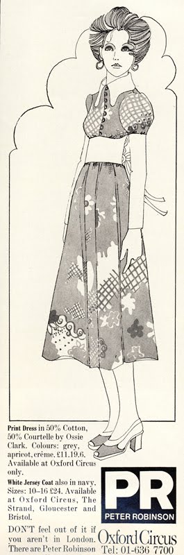 Now here we are again. Ossie Clark at Debenhams. You might wonder why I didn’t kick up an angry song and dance about the House of Fraser usage of the Biba brand for purely commercial ends. To be honest, like many people I have something approaching Biba relaunch fatigue. Frankly I’m almost at the point of vintage fatigue, thanks to the endless pilfering of ‘inspirations’ which are frequently little more than duplications (see Kate Moss for Topshop… in fact, see Topshop. Full stop.) and the, albeit fair enough, archive collections by Laura Ashley and River Island’s Chelsea Girl. I may or may not have walked past a House of Fraser store window, decked with faux Biba, and flipped the finger. It didn’t seem worth blogging about though. I just sit and judge from a distance.