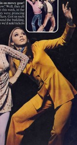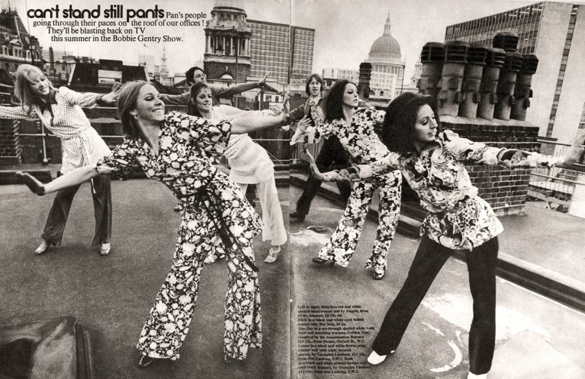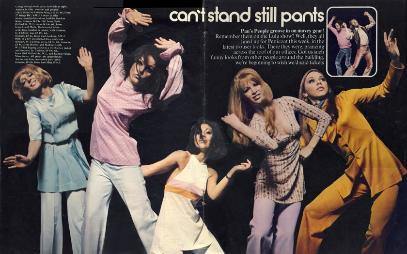 Here’s a delightful (but a delightful pain-in-the-arse to scan) photoshoot with my favourite dance troupe, Pan’s People, from Petticoat Magazine (May 1969). I suppose trousers for women were still something of a novelty in 1969, but there’s no excuse for usage of the word ‘pants’ for trousers in a British magazine.