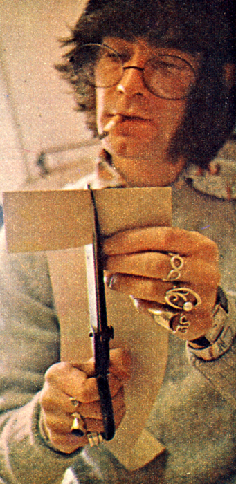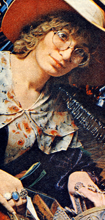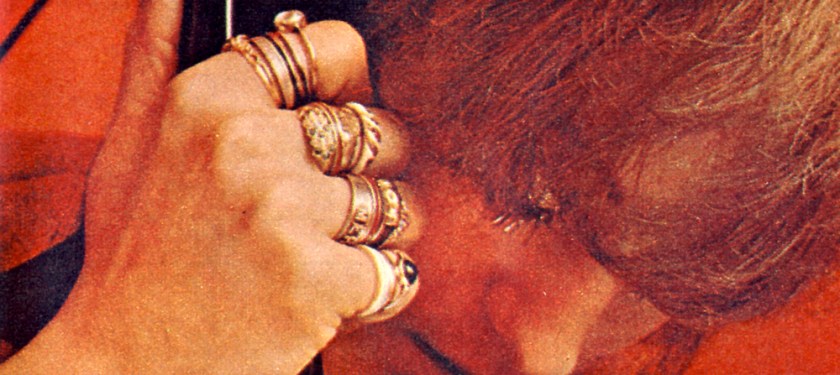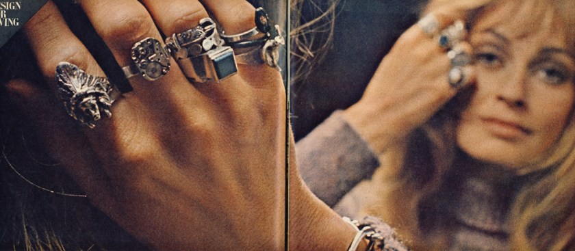 When popstar Lulu announced her engagement to musician Maurice Gibb a few months ago, most newspapers published pictures of her holding hands with her fiance. Underneath were captions which stated: “Lulu shows off her sapphire and diamond ring.” But in the photos=graohs they were both wearing so many different rings it was impossible to make out which one was the engagement ring – or who, for that matter, was wearing it. Pictures like these show that there is a growing fashion for wearing masses of rings all crammed on at once. It’s a craze that has sprung up as a sort of antidote to the growing uniformity of clothes. Last winter when most people were racing around in pants, long sweaters and clumpy shoes, the only way of looking remotely original was to wear different scarves, unusual belts or jewellery. Actress Suzy Kendall (above), who has been a keen collector for some time, said that she picked up this selection while on location in Yugoslavia and in Rome, and she bought others from a shop in Chelsea called Anschel’s. The rest of the people photographed on these pages acquire their bits and piece in much the same way. This is a craze that doesn’t cost much. Avid collectors say that it wouldn’t work with real stones – they would look too flashy – and they prefer more original bits.
