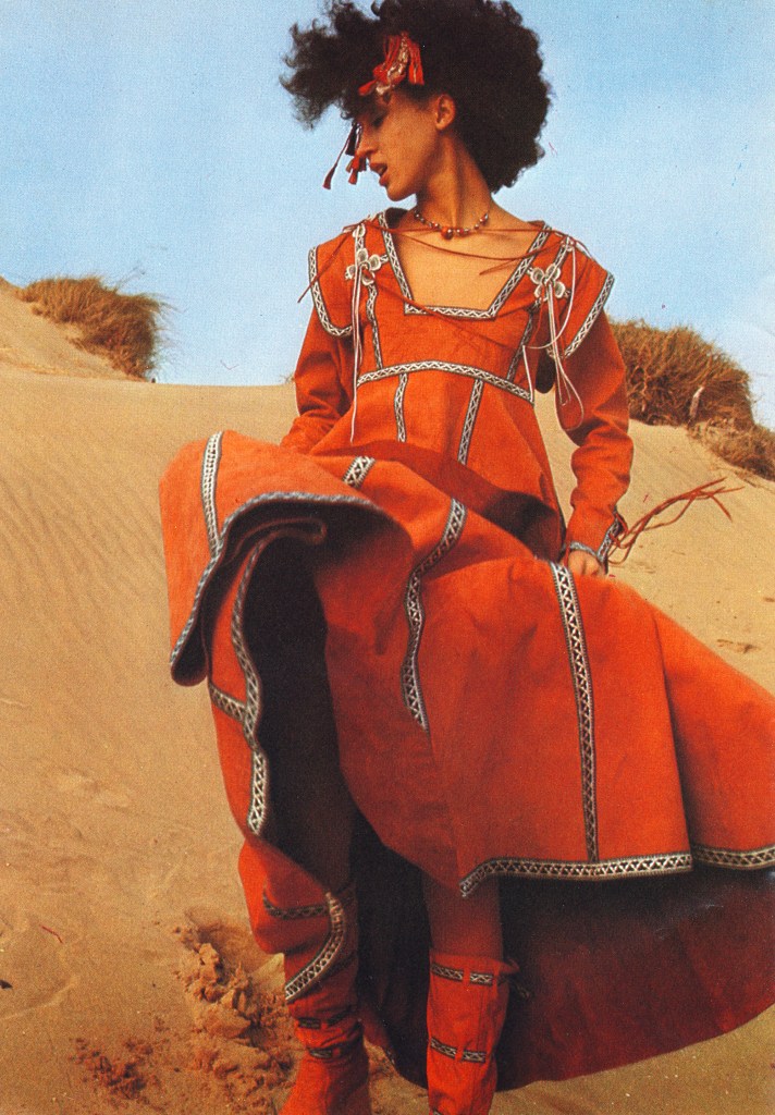 Photographer and clothes are uncredited (“intended to provide the reader with ideas for their own designs”). The model is Pat Cleveland and the clothes are by Bill Gibb.