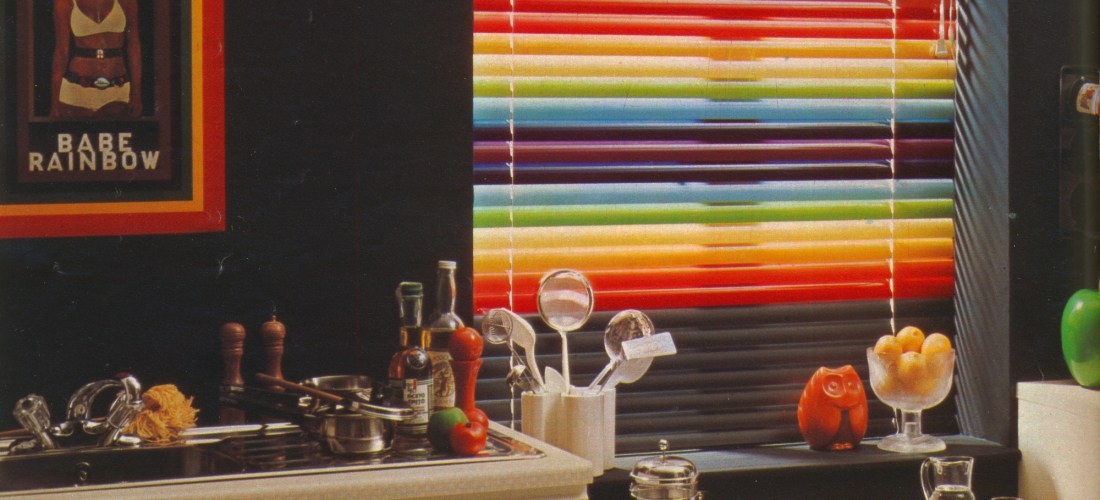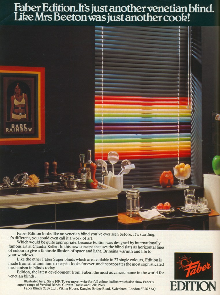 Advert for Faber Edition venetian blinds, designed by Claudia Keller. Featuring a print of Peter Blake’s ‘Babe Rainbow’.
