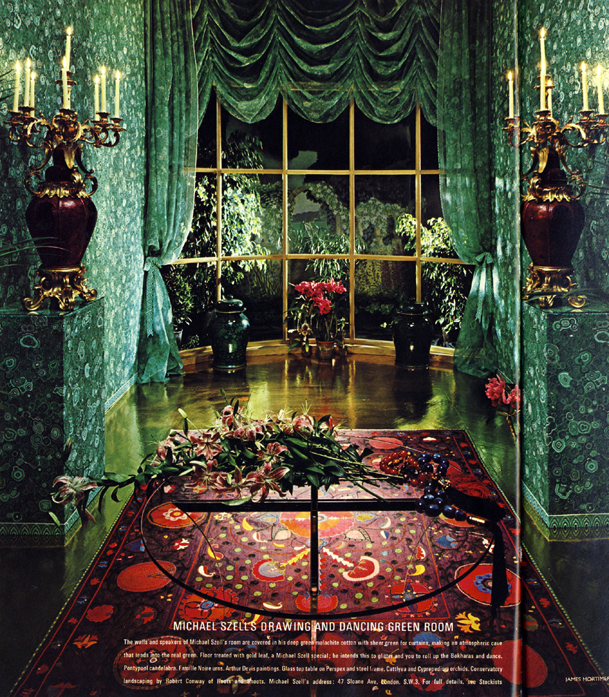 | Barbara Hulanicki in the sitting-room, the window open to reveal a jungle of climbing plants outside. In the background, a collection of Art Deco glass below the enormous mirror, at least six feet in diameter. Everywhere lamps, small, fringed or mushroom-topped on long, slender stems: everywhere figures, ferns, flowers. In foreground, a set of black/silver/turquoise vases and modelled head on decorated brass tray and glass-sided table: replica of a twenties’ cigarette girl, now bearing a tray of jewellery. |
