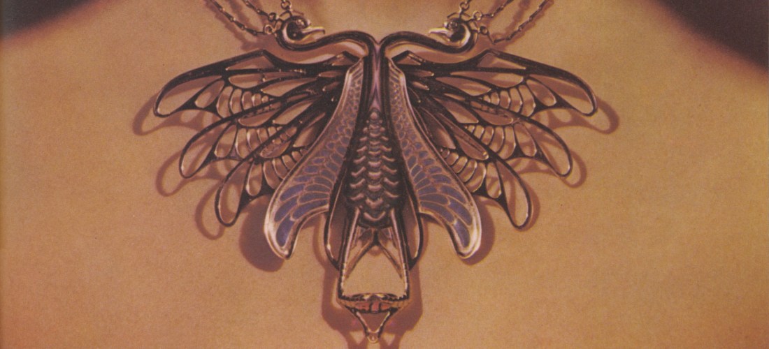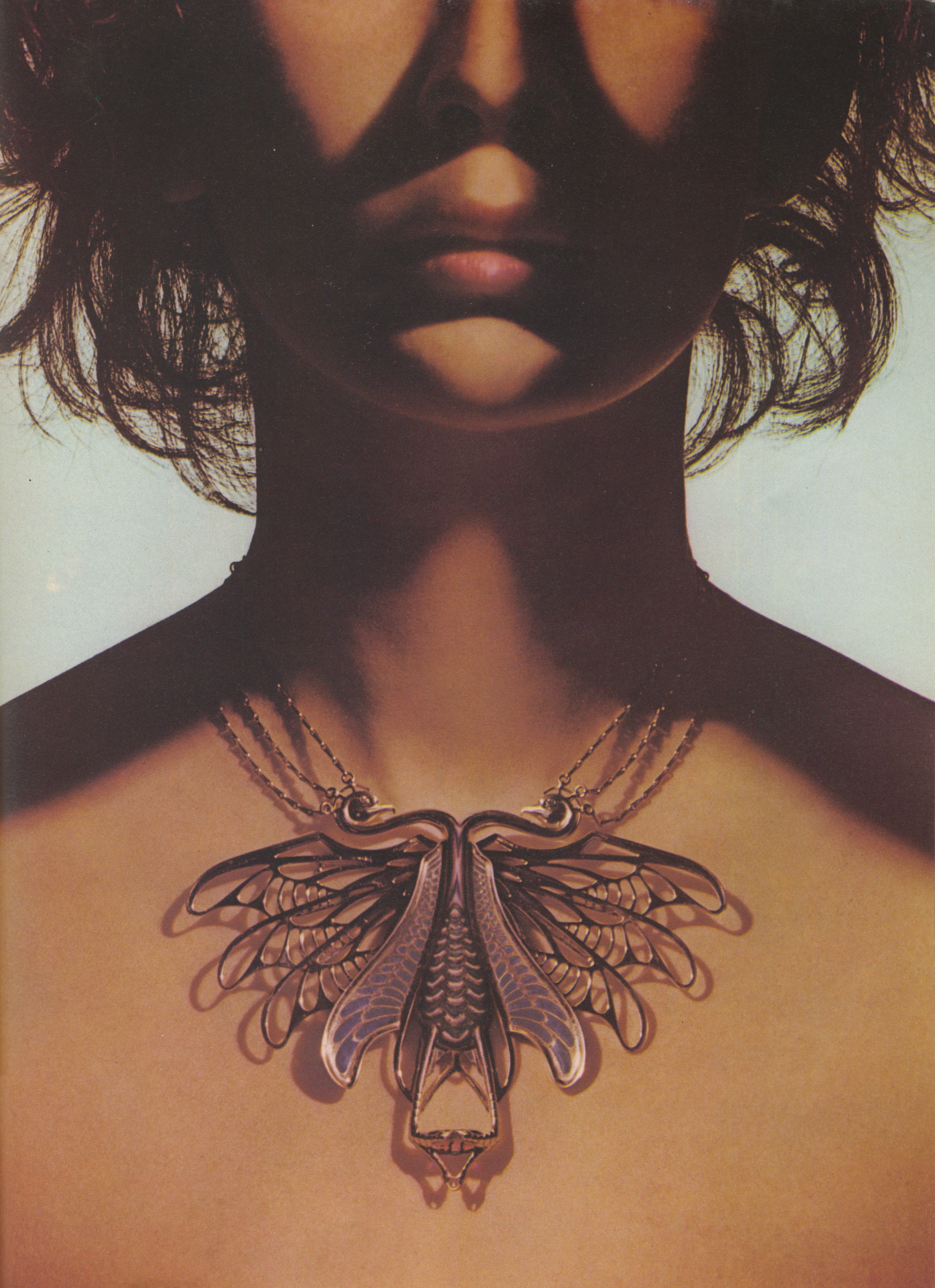 New flowering jewellery talent is David Courts from Hornsey and the Royal College of Art. His double-headed phoenix of violet champleve enamel, red gold, with diamond eyes, carrying an oval amethyst and suspended by three strands of draped chain, £1,500. David Courts’ work can be seen at Electrum, Upper Grosvenor Galleries, W.1.