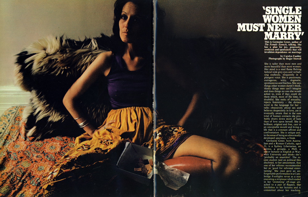 This is Germaine Greer, author of The Female Eunuch, talking. She has a plan for joy, generosity, eroticism and spontaneity that will invalidate dependence on marriage