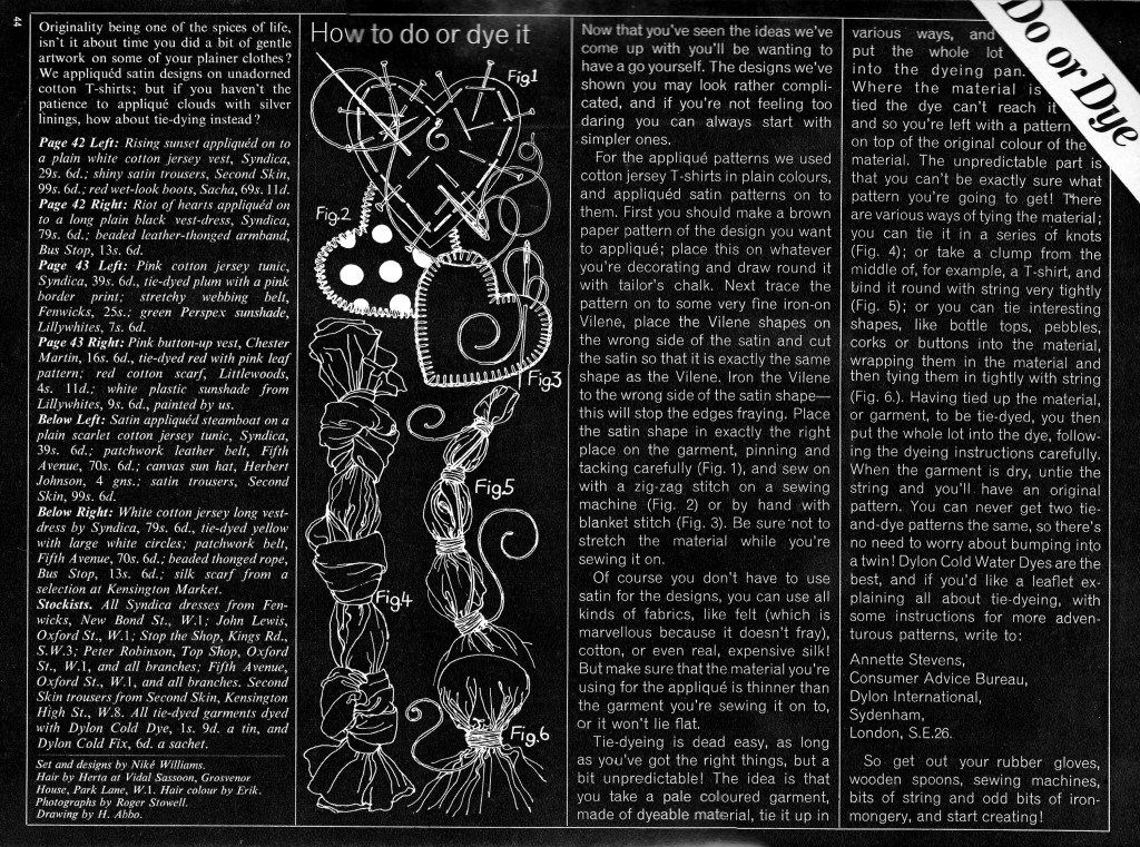 Originality being one of the spices of life, isn’t it about time you did a bit of gentle artwork on some of your plainer clothes? We appliquéd satin designs on unadorned cotton T-shirts, but if you haven’t the patience to appliqué clouds with silver linings, how about tie dye instead?