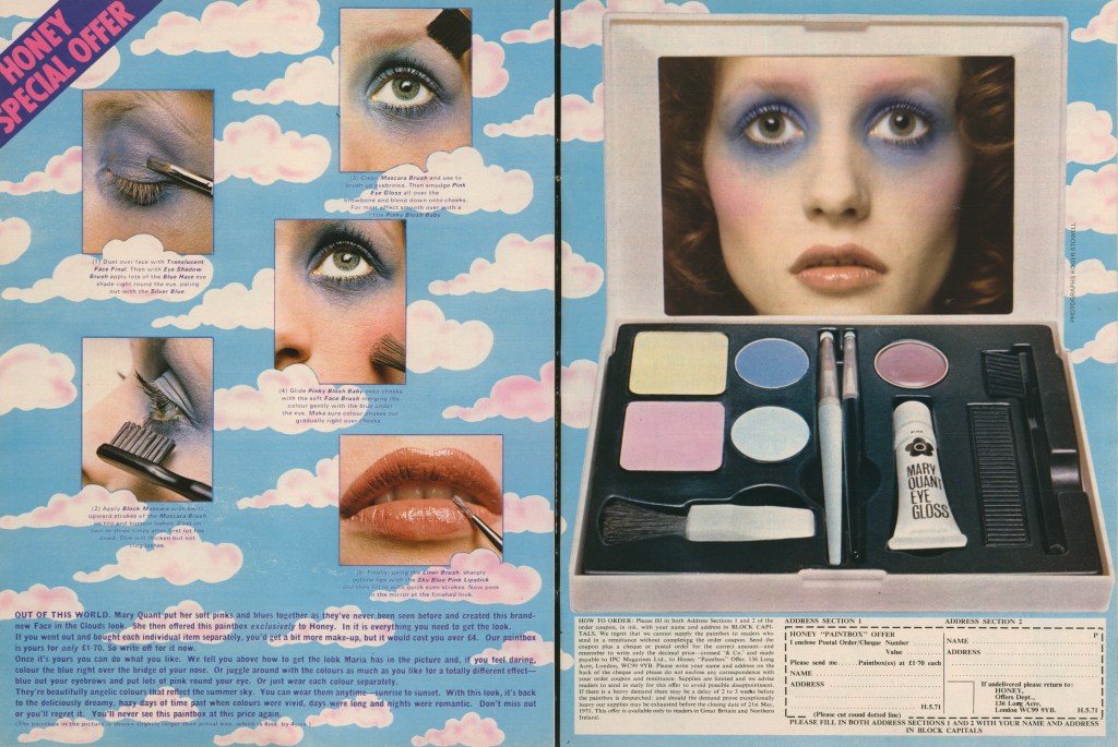 OUT OF THIS WORLD. Mary Quant put her soft pinks and blues together as they’ve never been seen before and created this brand-new Face in the Clouds look. She then offered this paintbox exclusively to Honey. In it is everything you need to get the look. If you went out and bought each individual item separately, you’d get a bit more make-up, but it would cost you over £4. Our paintbox is yours for only £1.70. So write off for it now. Once it’s yours you can do what you like. We tell you above how to get the look Maria has in the picture and, if you feel daring, colour the blue right over the bridge of your nose. Or juggle around with the colours as much as you like for a totally different effect—blue out your eyebrows and put lots of pink round your eye. Or just wear each colour separately. They’re beautifully angelic colours that reflect the summer sky. You can wear them anytime—sunrise to sunset. With this look, it’s back to the deliciously dreamy, hazy days of time past when colours were vivid, days were long and nights were romantic. Don’t miss out or you’ll regret it. You’ll never see this paintbox at this price again.
