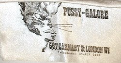 My solitary[ish] Pussy Galore piece is the tablecloth mini, but I also have a pair of purple suede hotpants (Made, apparently, for someone with a child-size bottom. Size 38 my….errr….arse!) which had this hang tag on them. I’m sure they must be Pussy Galore, but there isn’t a fabulous huge satin label inside. Just the hang tag. Dyed by the purple suede over the years. Isn’t it groovy?