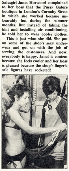 Well I never. All these years I’ve been moaning that I knew so very little about the Pussy Galore boutique, aside from the brief paragraph the V&A managed to unearth when they displayed my frock. Yet right under my nose, in a clearly somewhat under read copy of Petticoat magazine, was this little gem. Well, now I know why they didn’t last very long. I’m not sure I’d want to buy frocks from a girl in her underwear. I don’t care what they may say about rocketing lingerie sales, pah!