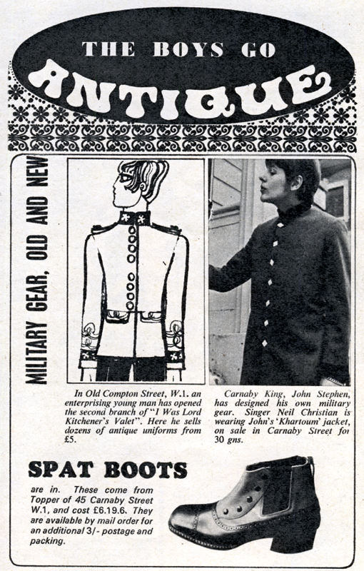 Carnaby Male catalogue advert and ‘The Boys Go Antique’ clipping both scanned from the same issue of Photoplay, April 1967.