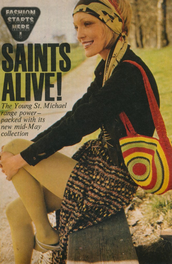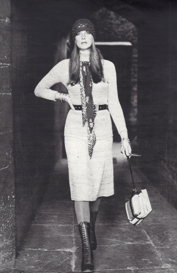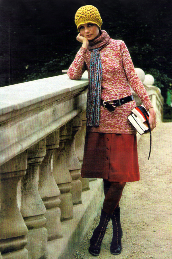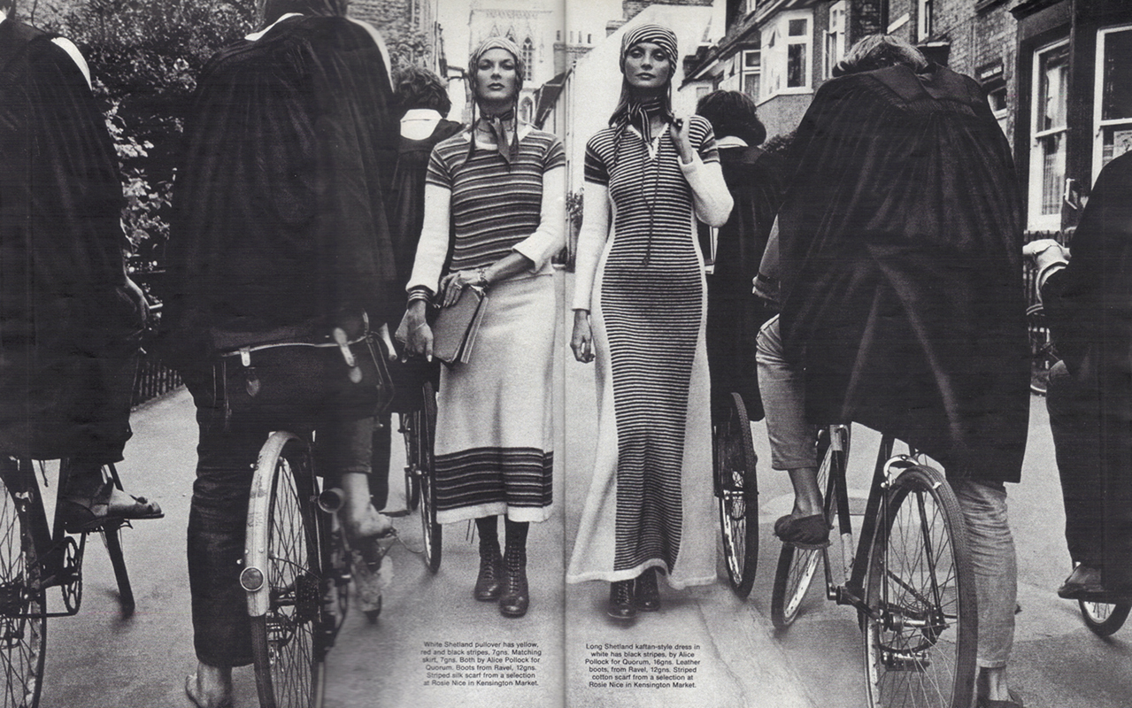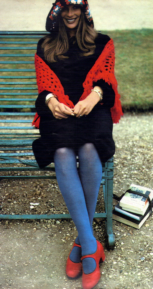 Left: Dress by Gillian Richard. Hand-knitted Shetland wool shawl by Foale and Tuffin. Shoes by Ravel. Right: Petrol blue jumper from C&A. Rust jersey skirt by Mary Quant’s Ginger Group. Blue lace shawn by Foale and Tuffin. Shoes by Anello and Davide.