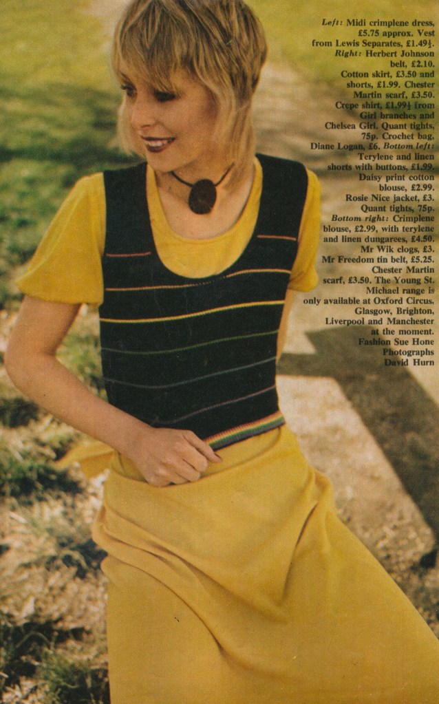 Midi crimplene dress, £5.75 approx. Vest from Lewis Separates, £1.49½.