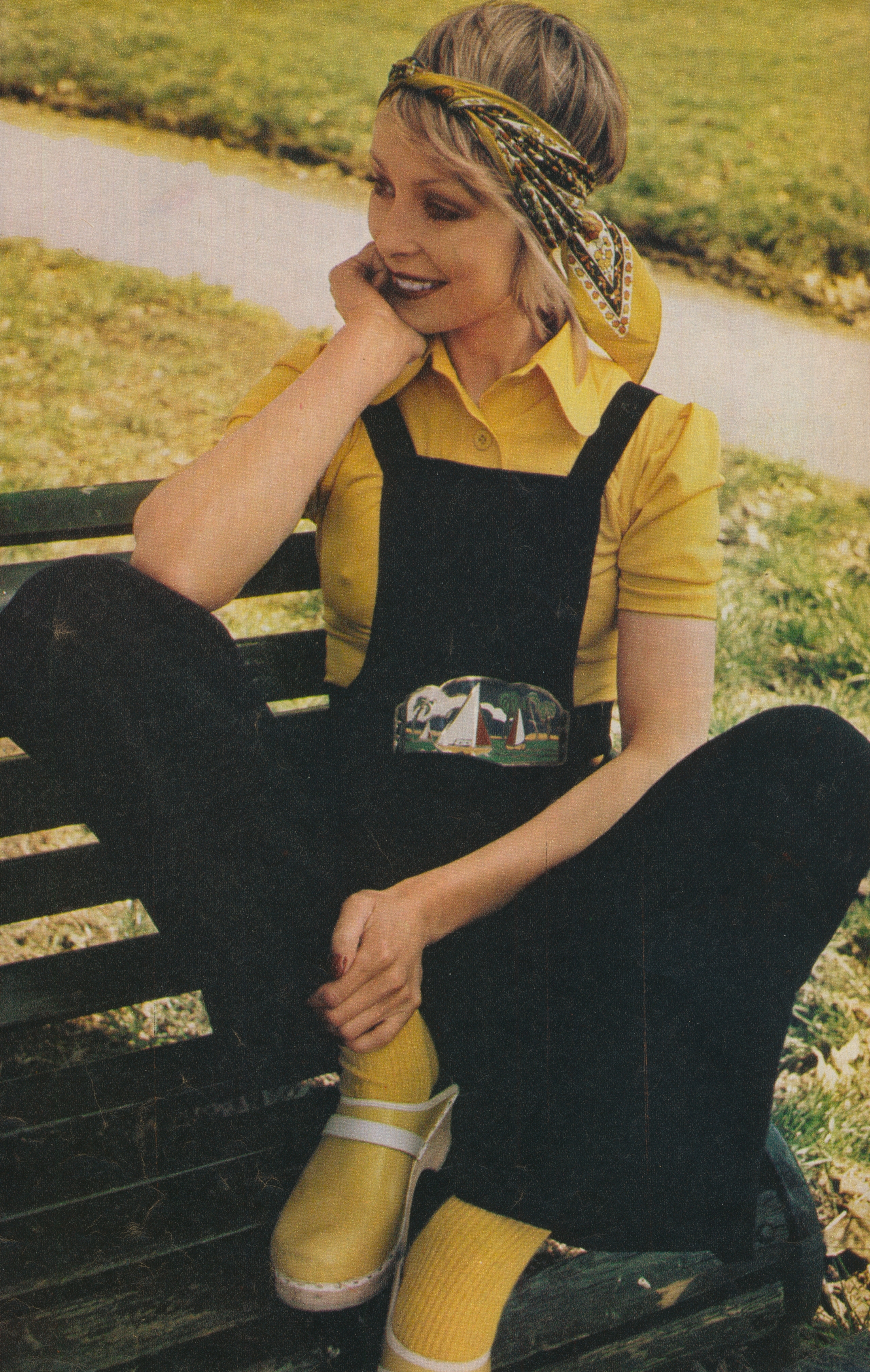Crimplene blouse, £2.99, with terylene and linen dungarees, £4.50. Mr Wik clogs, £3. Mr Freedom tin belt, £5.25. Chester Martin scarf, £3.50.