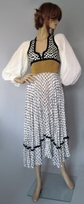 I have one Thea Porter gypsy dress which, despite never having found occasion to wear, I cannot bring myself to sell (the skirt is very sheer and, clearly, I will never find a suitably hemmed petticoat to go underneath….). I rather like the fact that mine is a monochrome (aside from the gold silk waist panel), but it doesn’t stop me slightly lusting after the coloured ones as well.