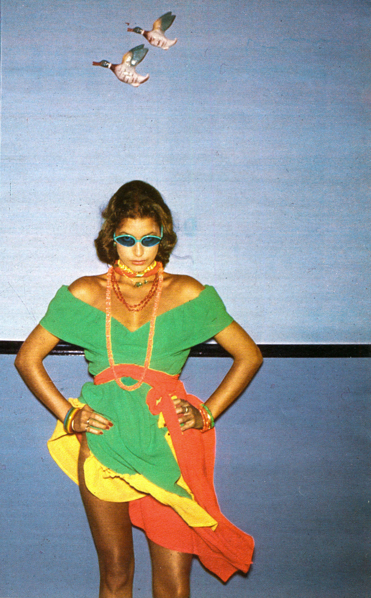 Down-town Mo Bay is a riot of colour. Houses are made of wood and painted red, blue, green or yellow. There’s a different colour at every step, so a walk down any street is quite an experience. Then there’s the soul music which blasts out of every shop, so you’ve got to look cool. Hence our choice of fun clothes to catch the eye even with all that competition.