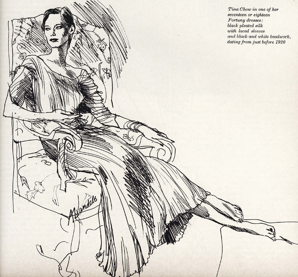 Mickey Mouse is an obsession of Michael Chow, figuring five times, in cast iron, in Chinese rug work, in china, in tin, and even in abstract—Oldenberg’s sculpture in front of the desk. Michael, who runs five restaurants and one club in London, and is opening a restaurant in Los Angeles, is a compulsive collector. His office in a studio flat in Knightsbridge contains a splendid Art Deco desk on a platform, an Art Nouveau rug, two Richard Smiths, and a Robyn Denny, all bathed in Mozart and Bach, with windows opening on to a flower-filled verandah. “It’s a thinking office more than a working office. I sit at the desk and toss a coin for where I’ll go to lunch.” Michael and Tina Lutz were married recently. Tina is wearing an orchid pink mushroom pleat Fortuny bought at a Christie’s sale.
