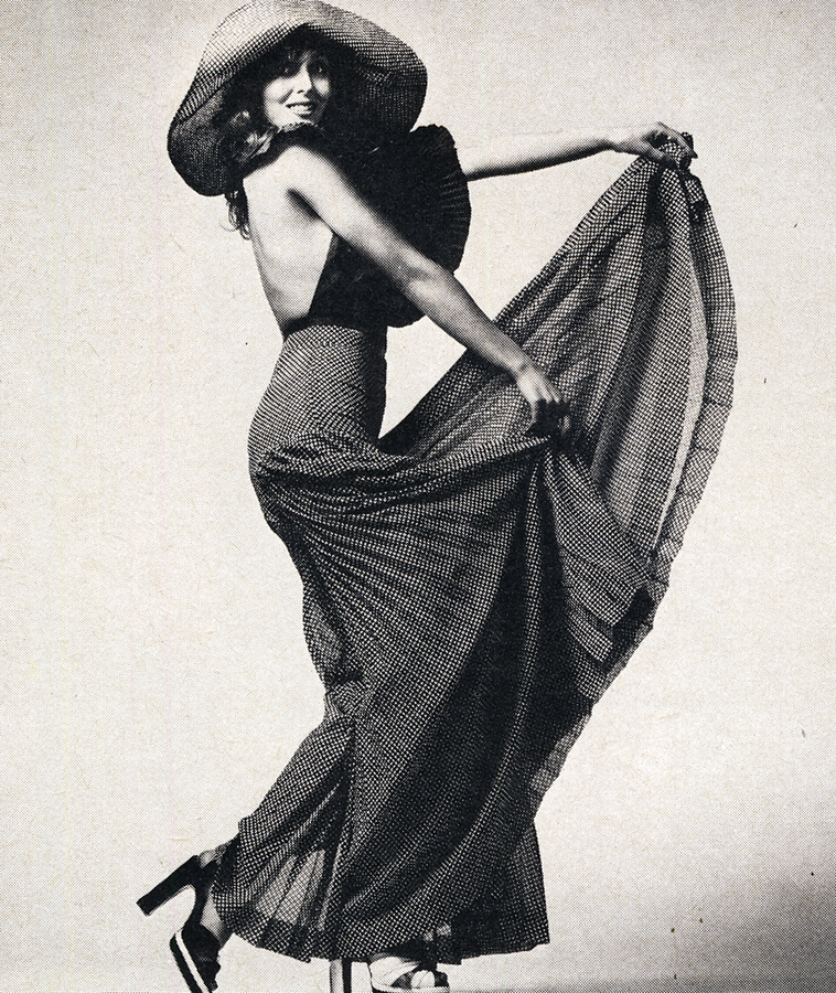 Christopher McDonnell must dream in black and white, and all his dreams must star Ginger Rogers and Rita Hayworth. Because, when it comes to designing clothes, this twenty-eight year old ex-Royal College of Art designer is the very spirit of Hollywood: his clothes have backless bodices, necklines to the navel and skirts that grip the bottom and then flare in Busby Berkley pleats. His model girls, smiling jammily through their bright lips, false eyelashes and heaving curls, snap along on platform soles. One of today’s top stars, Anouk Aimée, is his favourite customer. Here, model Kari-Ann wears black taffeta top and pleated dotted culottes by Christopher McDonnell, £35. Hat by George Malyard. Shoes by Terry de Havilland, exclusive to Marrian McDonnell.