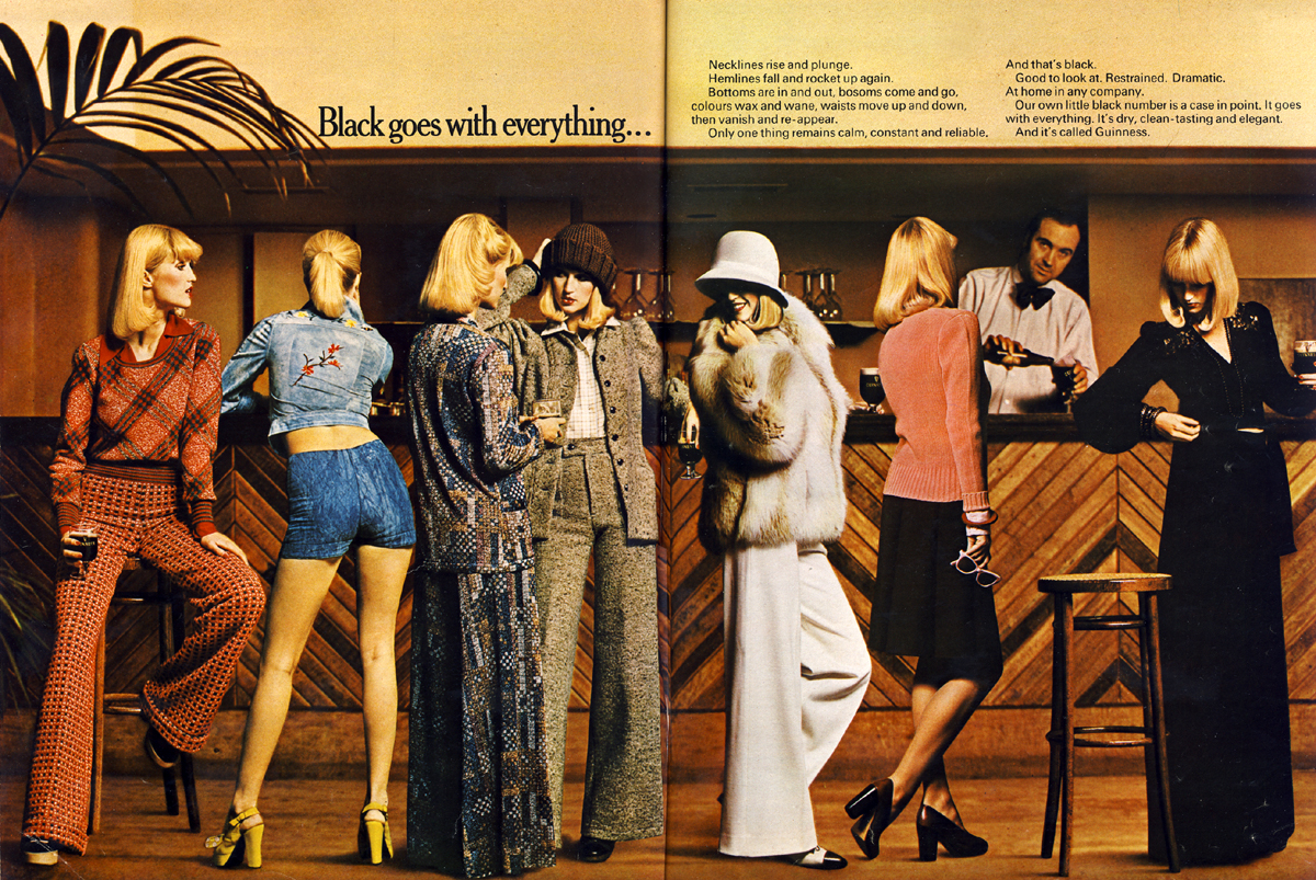 Necklines rise and plunge. Hemlines fall and rocket up again. Bottoms are in and out, bosoms come and go, colours wax and wane, waists move up and down, then vanish and re-appear. Only one thing remains calm, constant and reliable. And that’s black. Good to look at. Restrained. Dramatic. At home in any company. Our own little black number is a case in point. It goes with everything. It’s dry, clean-tasting and elegant. And it’s called Guinness.