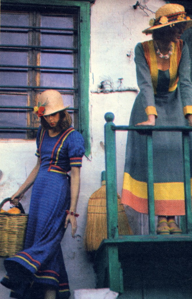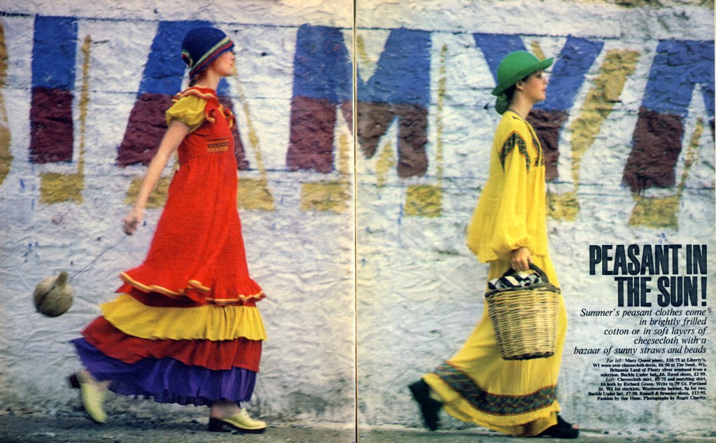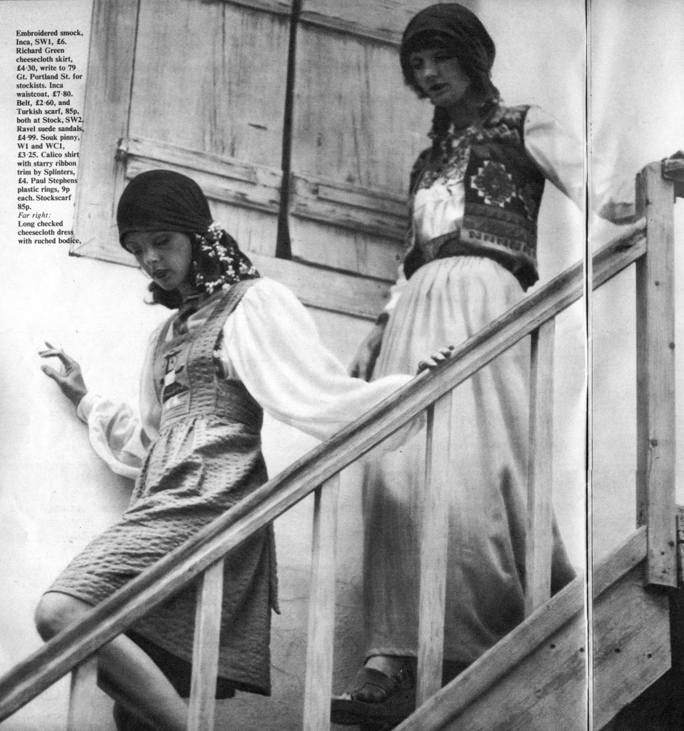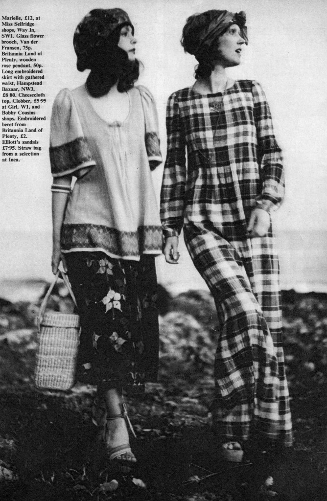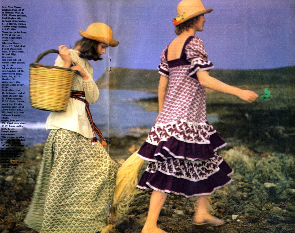 Dark girl wears a midi-length frilled striped cotton button-through skirt; £9.95, by Judit Ullman for Ronnie Stirling. Green and white striped top; £3.25, from all branches of Dorothy Perkins. Red satin wedge shoes; £7.95, T. Elliott. Socks; Mary Quant. Straw hat; £5, Biba, Kensington High Street, W8. Blonde girl wears a green and navy print cotton top, £4, and frilled skirt, £4.75; from Laura Ashley, 157 Fulham Road, SW3.