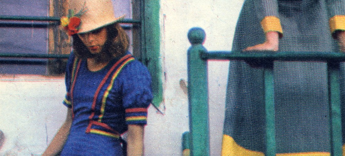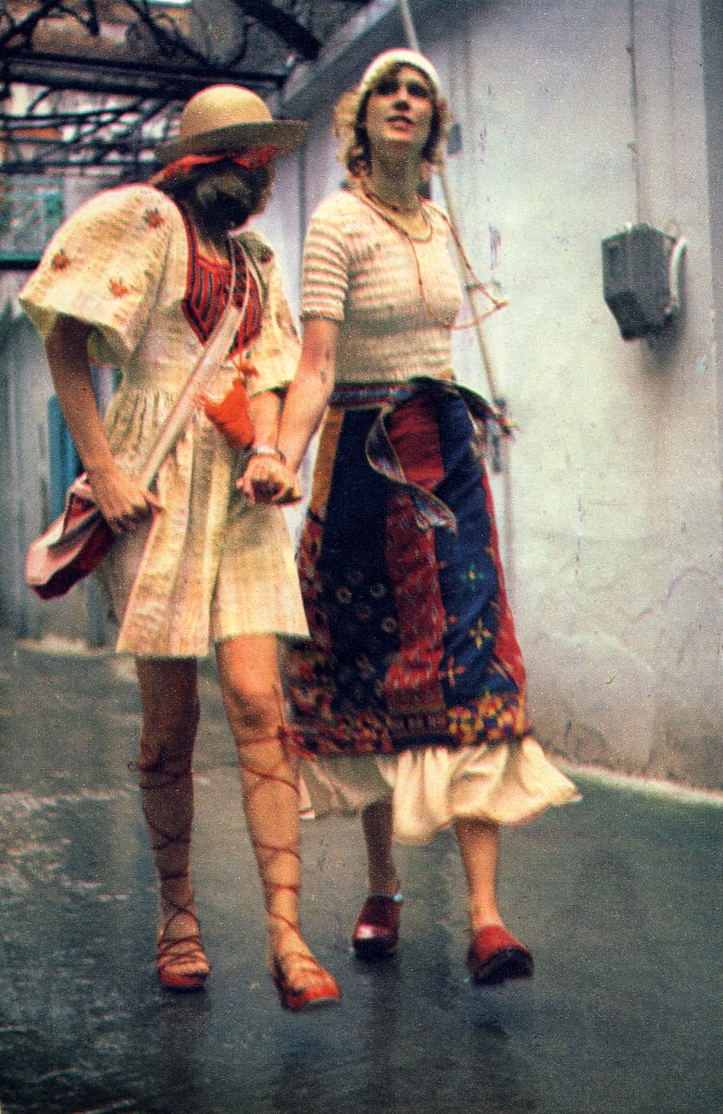 Dark girl wears a yellow and red jersey suit; £12.95 from Mr Freedom, Kings Road, London; SW3. Long red socks by Mary Quant. Red and yellow “Kicker” shoes; £9.50 from Bugatti, Kensington Church Street, London, W8. Blonde girl wears a blue print satin blouson jacket; £15, by Jeff Banks, from Top Shop at Peter Robinson. Blue Trevira gaberdine trousers with two narrow belts; £8.99, by Shelana. Embroidered cap; £2.20, by Edward Mann, from Simpson, Piccadilly, WI.