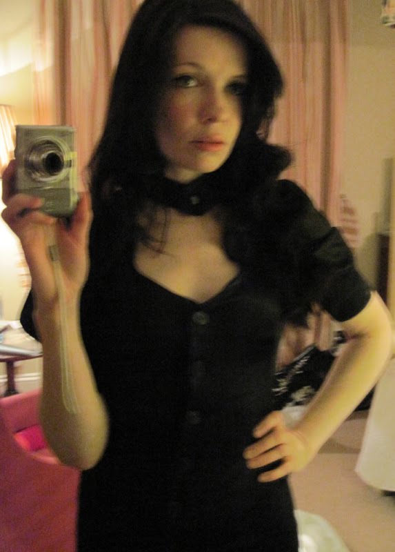 And here is a [deliberately] blurry photo of the top of the dress. It’s black satin, ridiculously puffed sleeves and an integral choker, which is perfect for a jewellery dunce like me. I always forget to either bring anything or to put it on before leaving, so I’m rather fond of things which prevent me from even needing it.