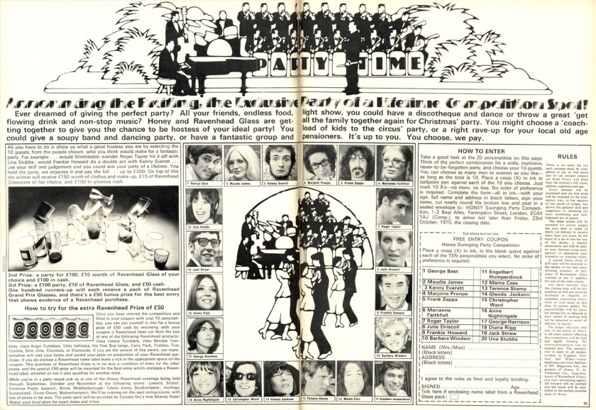 Which ten would I pick for my dinner party? Diana Rigg and George Harrison for beauty, wit and talent. Frank Zappa and Kenny Everett, to see what on earth would go on between the two of them and to see whether they could crack a smile from Terence Stamp. Una Stubbs seems like she’d be awfully good fun, and Marjorie Proops could probably help dear Marianne Faithfull quite a bit. Anne Nightingale could ensure the music selection was perfect, and finally I’d have Engelbert Humperdink there – purely for washing-up and general dogsbody purposes.